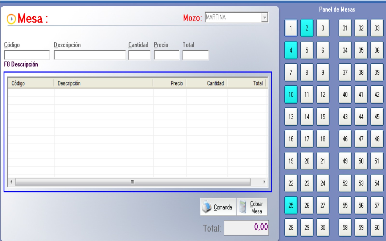 Podrá seleccionar el mozo que atendió a la mesa seleccionada, esta información será importante a la hora de hacer un reporte de caja diaria, ya que podrá realizar una búsqueda por mozo, esta información le permitirá hacer un análisis por ejemplo, de que horario le produce mayores ventas, saber que mozo hace mejores ventas, etc.